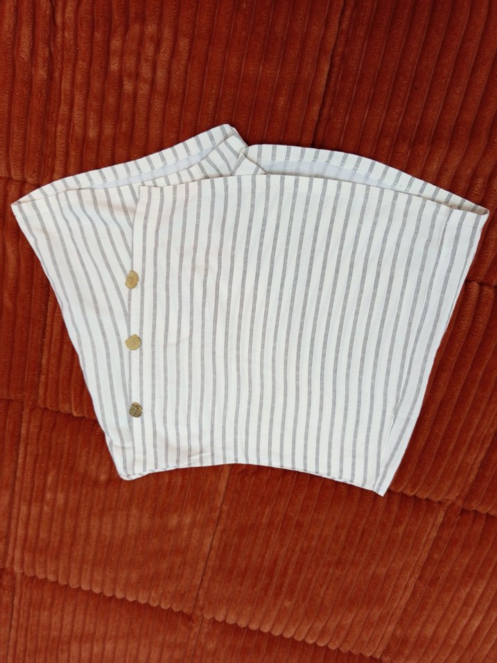 Düğmeli, keten kumaştan, beyaz-gri çizgili, bol kesim mini hamile eteği. Rahat ve bohem tarzıyla günlük kullanıma uygundur.