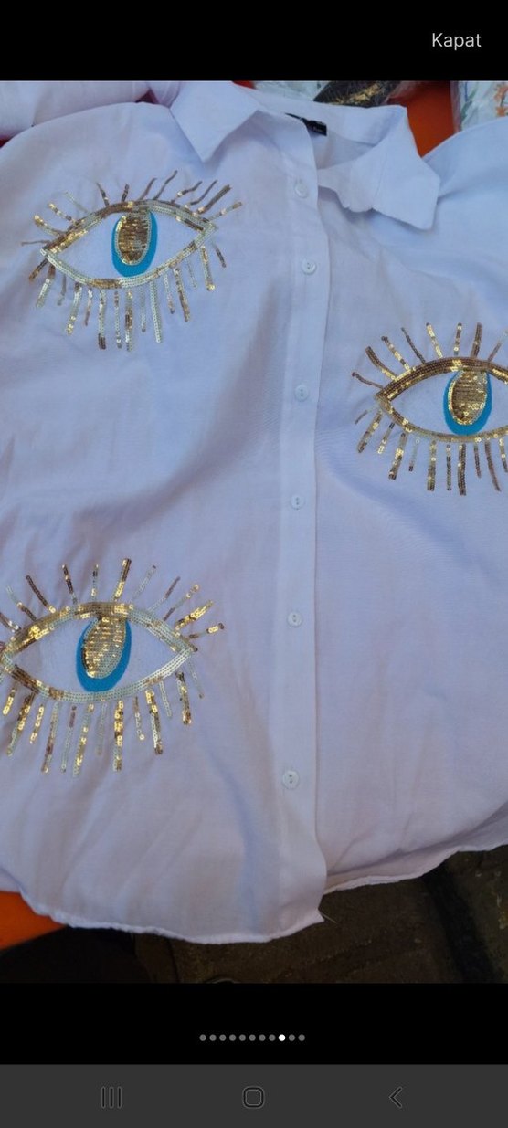 Düğmeli, yakalı ve uzun kollu beyaz gömlek, bol kesim ve kısa boyda. Parlak nakışlı göz desenleriyle bohem tarzı yansıtıyor.