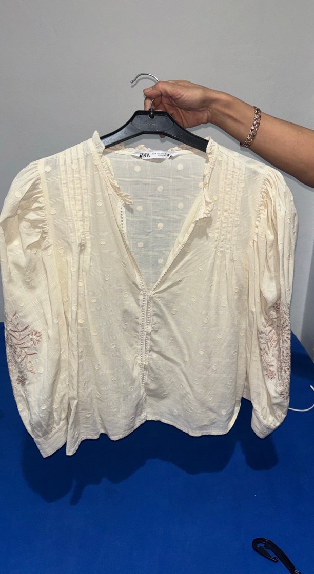 Uzun kollu, düğmeli ve V yakalı beyaz keten gömlek. Nakış detaylarıyla bohem tarzını yansıtır, günlük kullanıma uygundur.