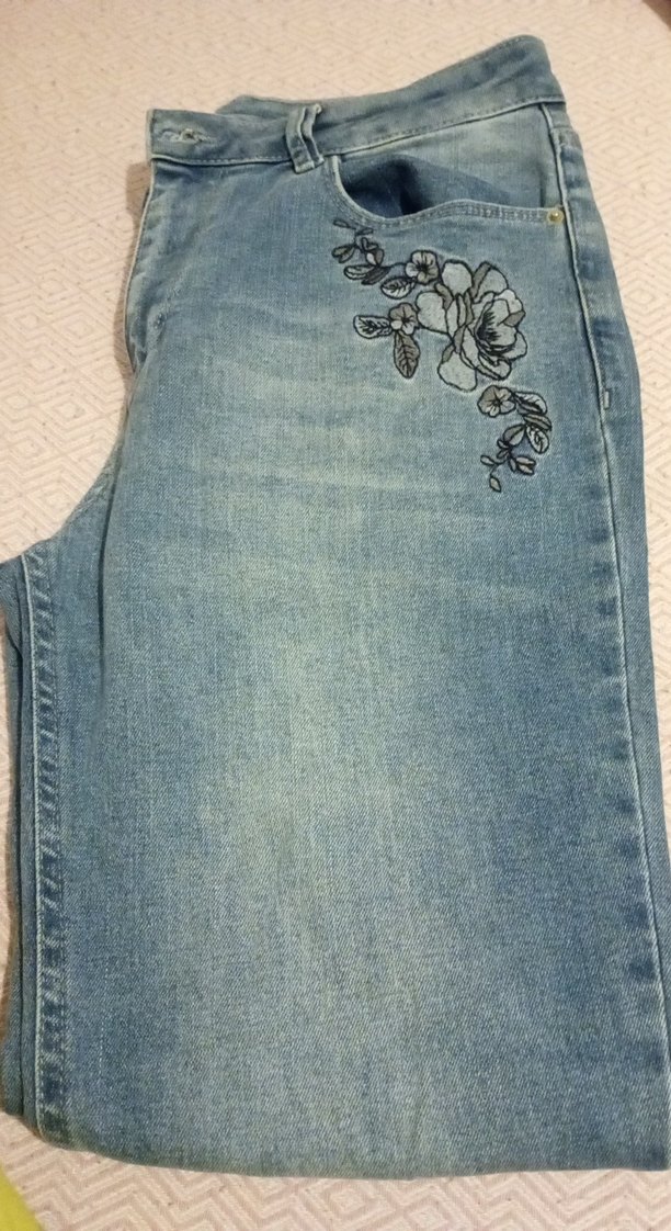 Düğmeli, bol kesim kadın kot pantolon, mavi renkte ve nakışlı çiçek desenleriyle bohem tarzını günlük kullanıma sunuyor.