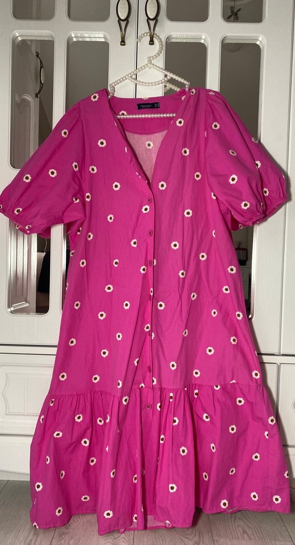Düğmeli, V yaka, kısa kollu, bol kesim pembe midi elbise. Canlı renkli baskılı ve bohem tarzda tasarlanmıştır. sadece ilk düğmesi kopmuştur