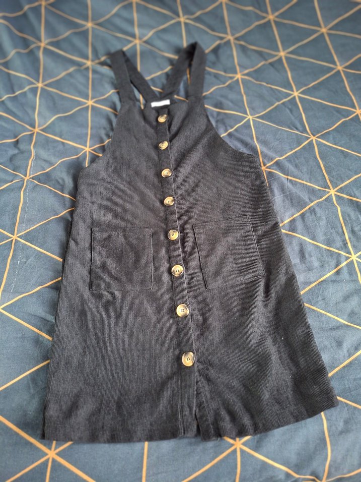 Düğmeli, nakış detaylı, siyah renkli, bol kesim ve kolsuz kız salopet, yumuşak sentetik kumaştan yapılmıştır.