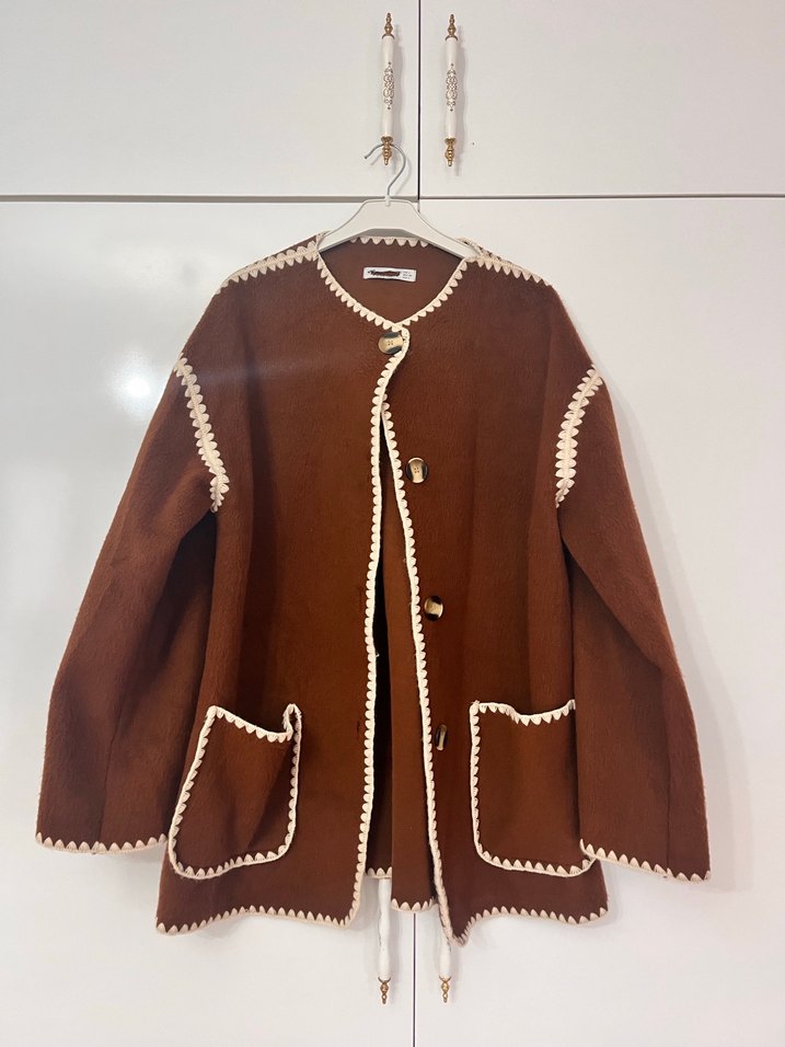 Koyu kahverengi triko kumaştan, bohem tarzında, düğmeli ve nakış detaylı, uzun kollu, midi boy, bol kesim kadın ceket. Cep detayları bulunur. Sayılı giyildi hasarı geçtim tüylenmesi bile yok artık tarzıma uymadığı için satıyorum