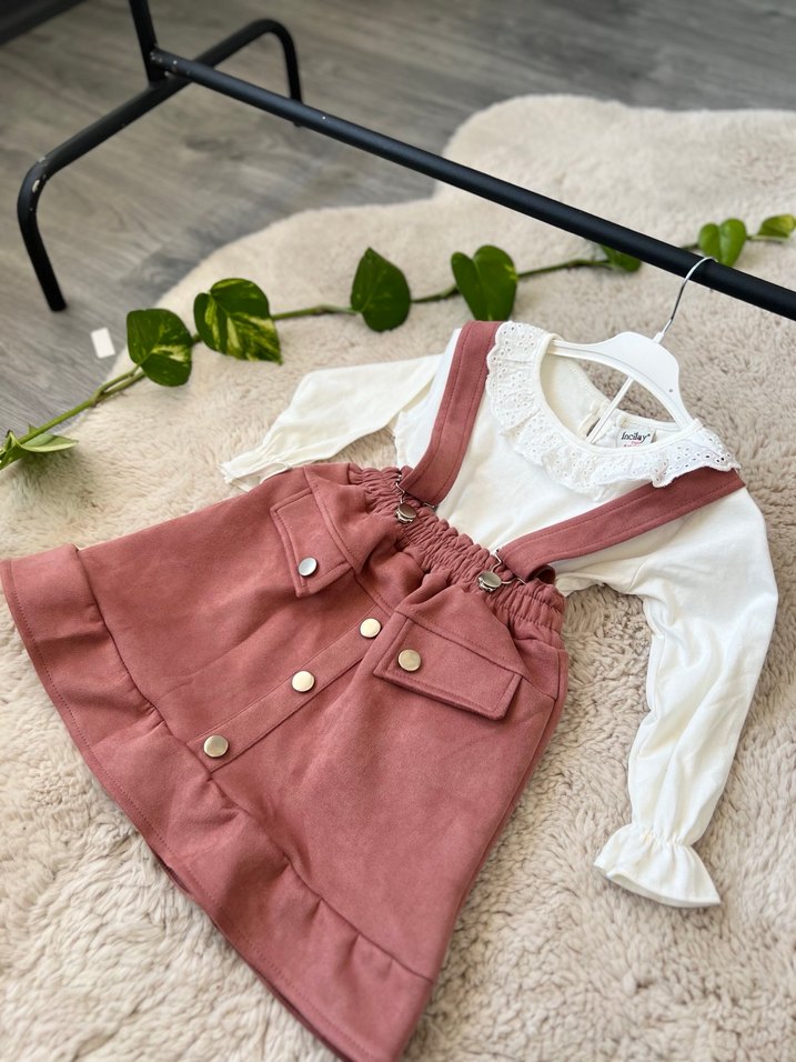 Düğmeli, askılı yakalı, nakışlı desenli pembe süet kız elbisesi. Bohem tarzda, rahat ve şık görünümlü.