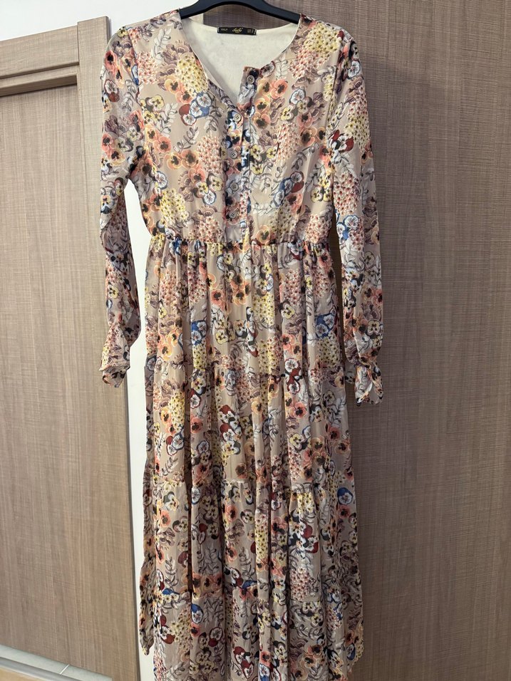 Düğmeli ön kısmı, uzun kollu, bol kesim bohem uzun elbise. Pastel çok renkli batik desenli, yuvarlak yaka. Yumuşak sentetik kumaştan, günlük kullanıma uygun.