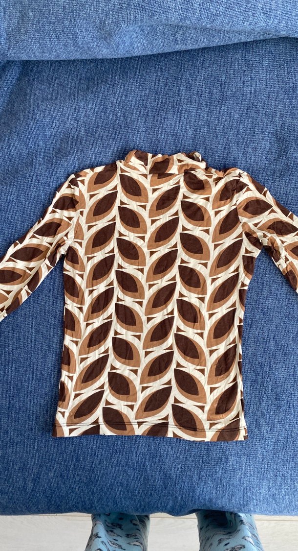 Düğmeli detaylı, bohem tarzda, kahverengi desenli, yumuşak sentetik kumaştan uzun kollu ve dar kesim kadın bluz. Günlük kullanıma uygundur.