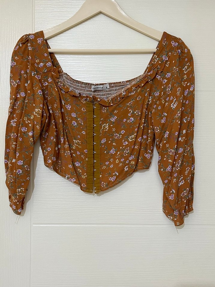 Bohem tarzda, kayık yaka ve uzun kollu, bol kesim kahverengi çiçek desenli, düğmeli bluz. Yumuşak sentetik kumaştan, günlük kullanıma uygun.