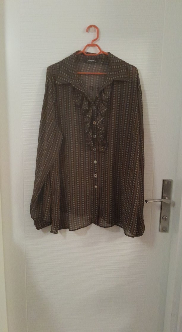 Düğmeli, uzun kollu, V yakalı, bol kesim kadın gömleği. Koyu kahverengi batik desenli, bohem ve vintage tarzda, yumuşak sentetik kumaştan üretilmiştir. Günlük kullanıma uygundur.