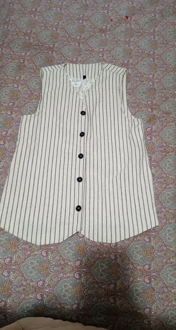 Düğmeli, V yakalı, nakışlı çizgili kadın yelek. Kolsuz, midi boy, regular fit ve bohem vintage tarzda. Beyaz ve gri tonlarda, rahat günlük kullanım için uygun.