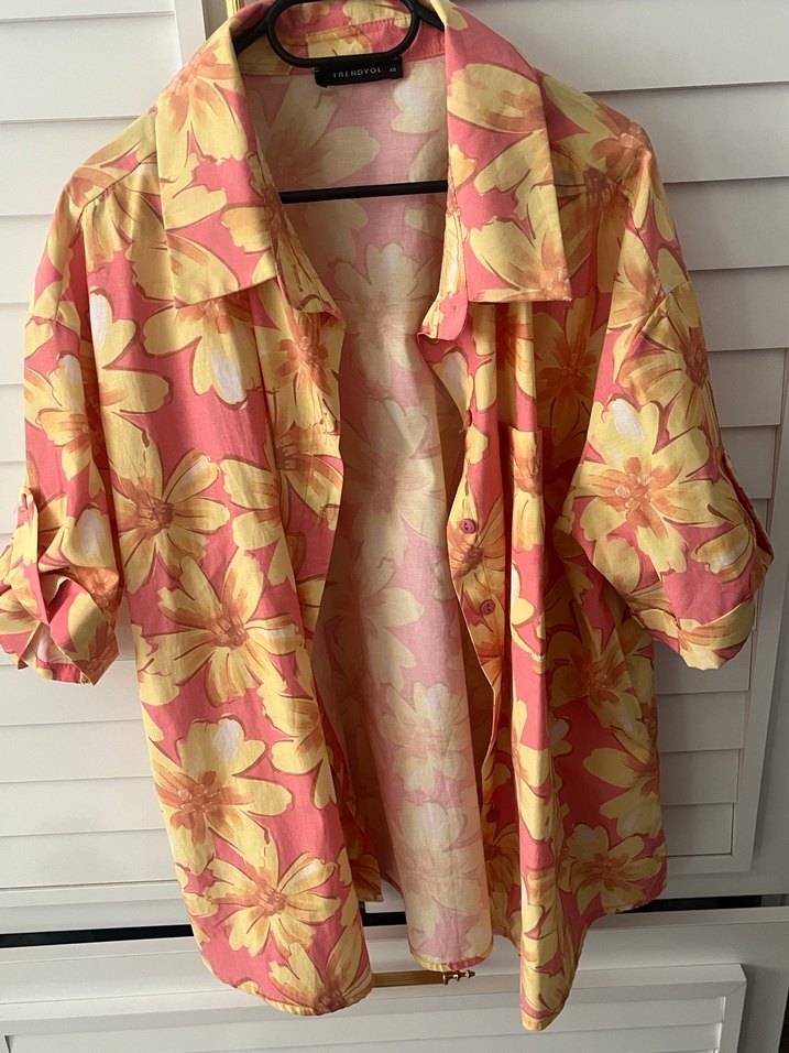 Düğmeli, kısa kollu, bol kesim kadın gömlek. Pastel pembe çiçek desenli, normal boyda ve yumuşak sentetik kumaştan yapılmıştır.