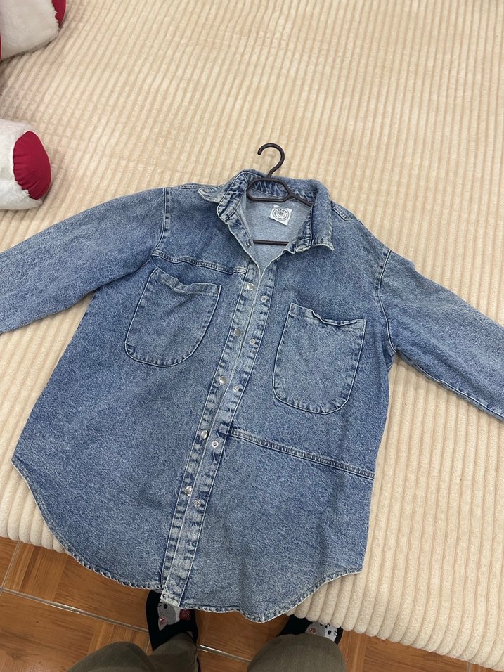 Uzun kollu, düğmeli, bol kesim kadın kot ceket. Mavi renkte, normal midi boyunda, günlük kullanıma uygun rahat bir sokak stili ürünü.