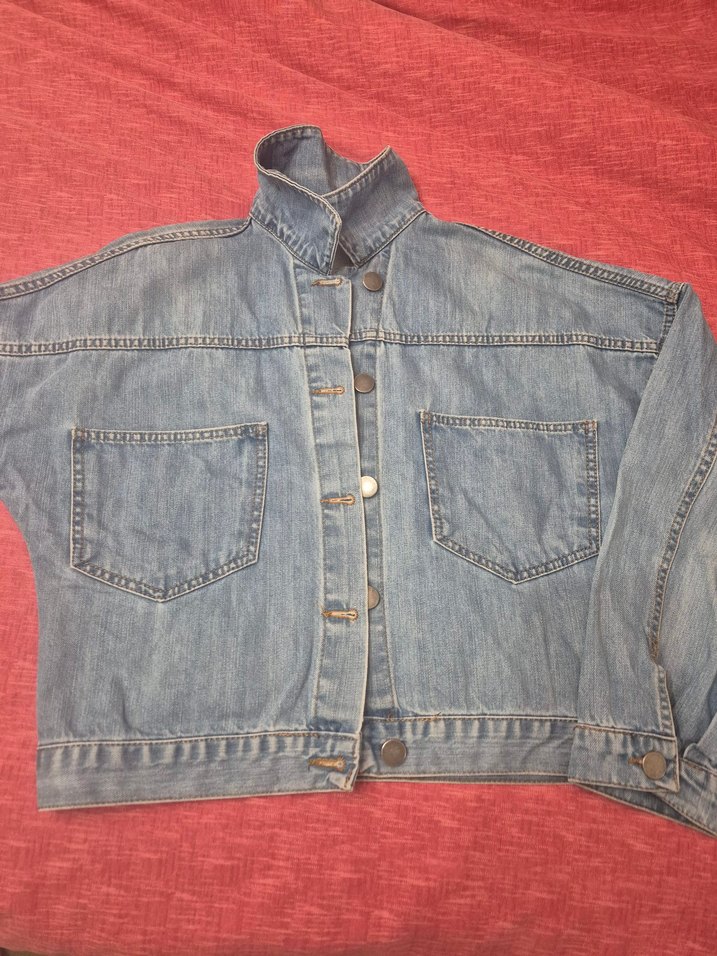 Mavi kot ceket, düğmeli ön, yakalı ve uzun kolludur. Bol kesimi ve iki ön cepli, günlük rahat kullanım için uygundur.