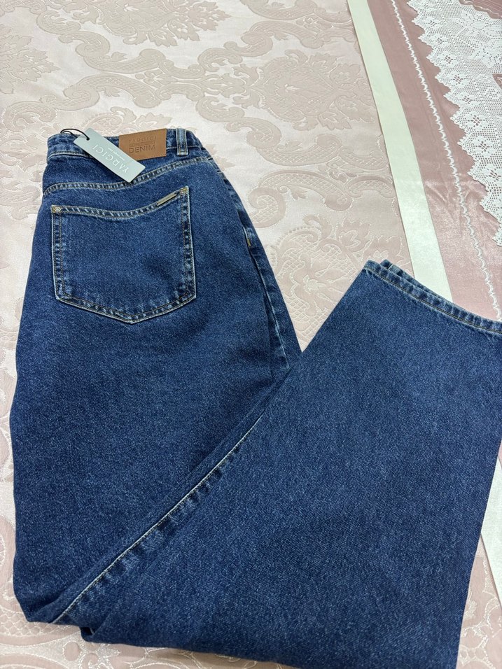 Düğmeli ön kısmı, bol kesimi ve normal boyu ile kadın kot pantolonu. Günlük kullanım ve rahat sokak stili için uygundur. Mavi renkte desensiz.uygulamadan alındı yeni etiketli 42 beden uyumlu
