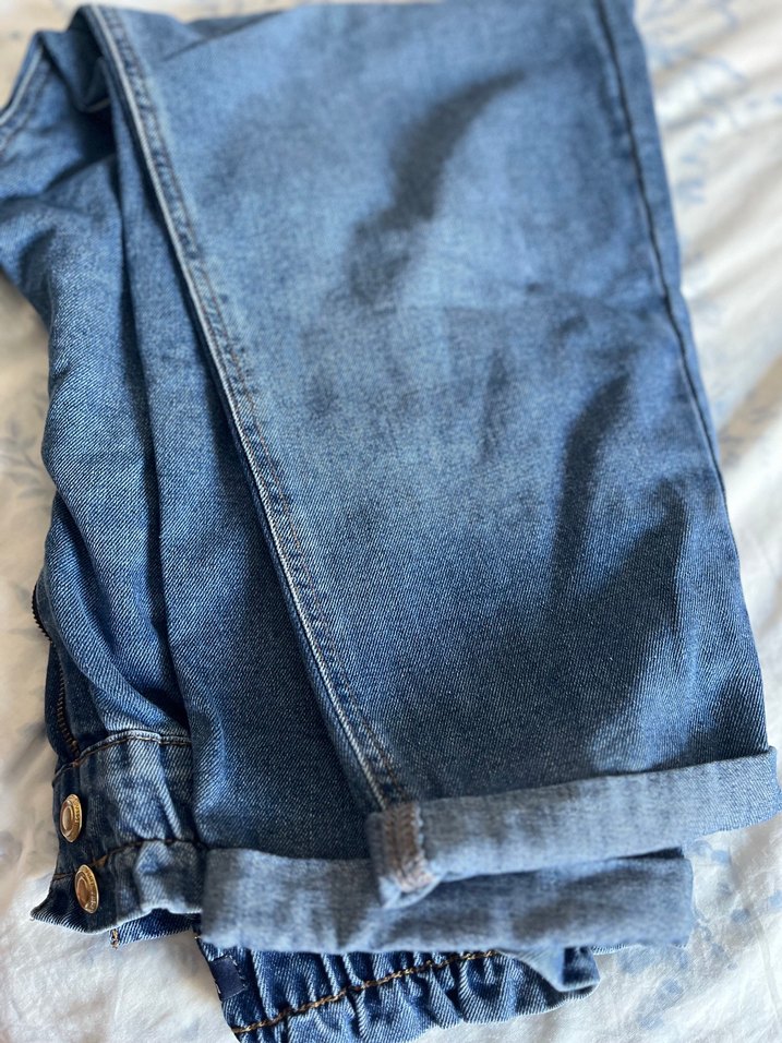 Düğmeli detaylara sahip bol kesim, normal boy kadın mavi denim jean. Günlük rahat kombinler için uygundur.