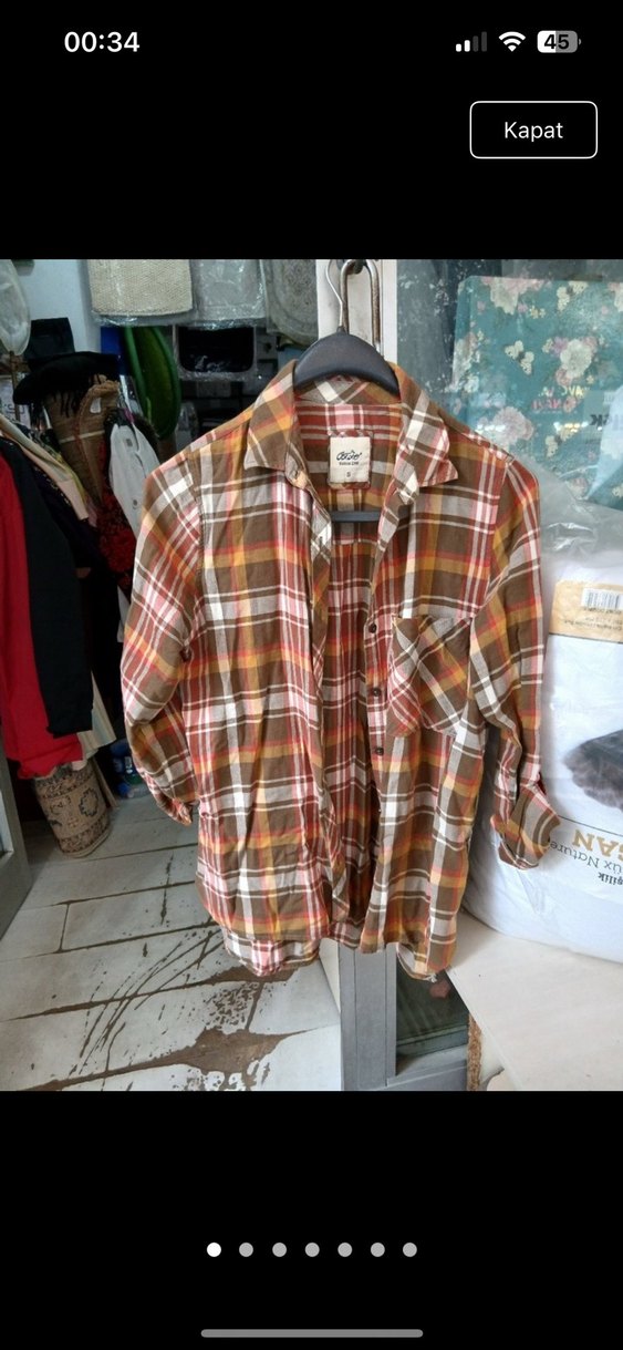 Düğmeli, bol kesim, yakalı ve uzun kollu kadın gömleği. Açık kahverengi kareli deseniyle rahat sokak stiline uygun. Yumuşak dokulu, midi boyda gömlek.