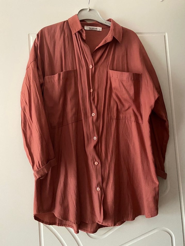 Kiremit renkli keten gömlek, düğmeli ön, yakalı ve uzun kolludur. Bol kesim ve midi boydadır, şık ve rahat bir görünüm sunar.