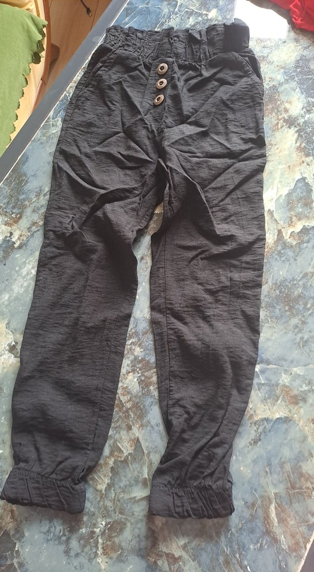 Düğmeli, bol kesim keten kadın pantolon, midi boy, koyu gri renkte, günlük rahat kullanım için uygun.
