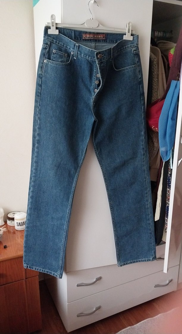 Koyu mavi kot kumaştan, düğmeli ve bol kesim midi uzunlukta, sade ve rahat günlük kullanım için uygun kot pantolon.