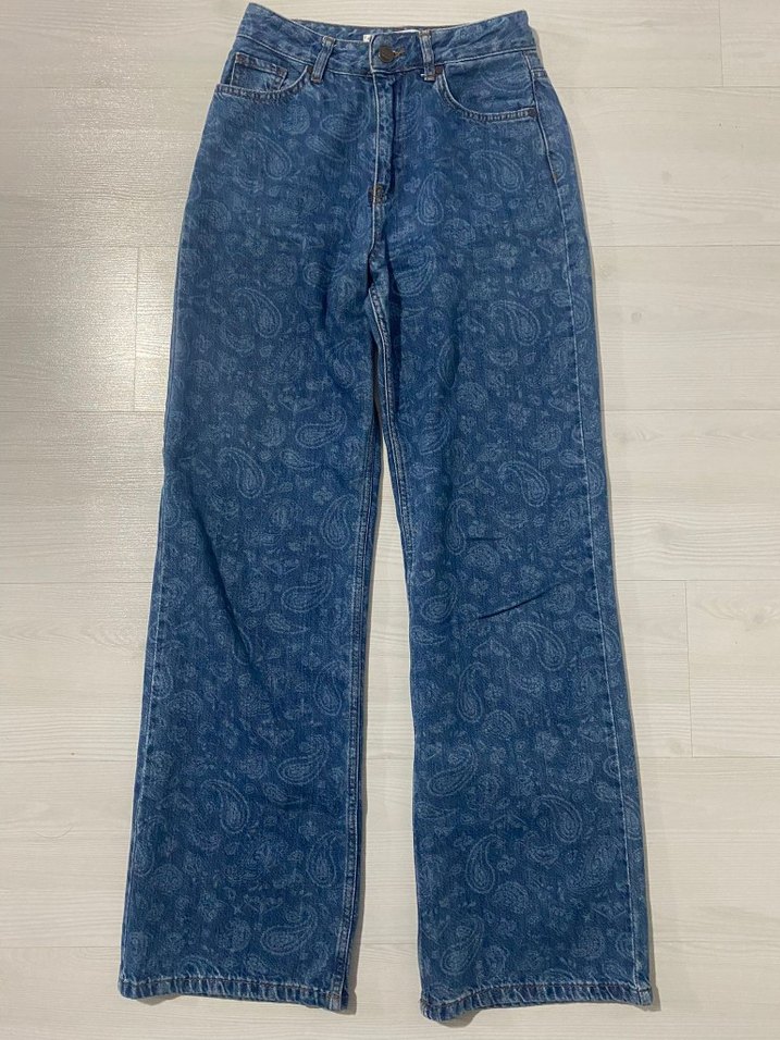 Düğmeli Bol Kesim Mavi Batik Desenli Kot Pantolon