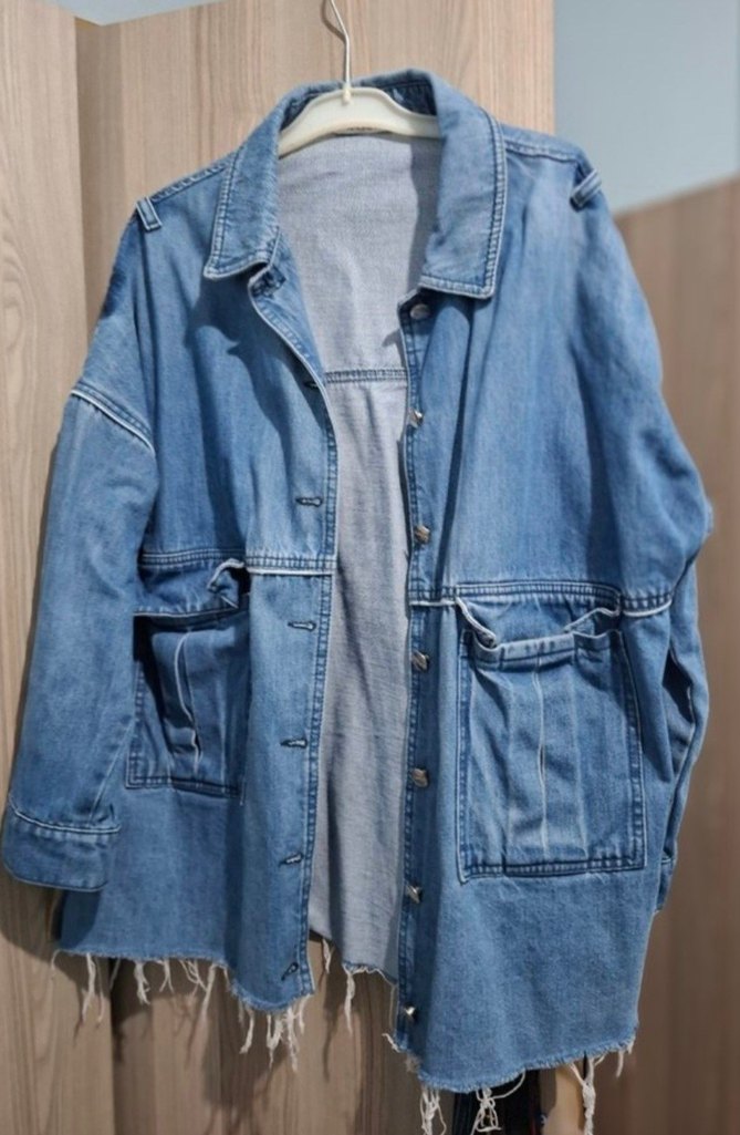 Mavi denim ceketin bol kesimi, düğmeli önü ve kesik yaka detayı vardır. Uzun kollu, günlük kullanım için uygun midi uzunluğundadır. omuzlarındaki kısmı söktüm orası biraz koyu duruyor normalde giyiyordum kilo aldığım için satıyorum