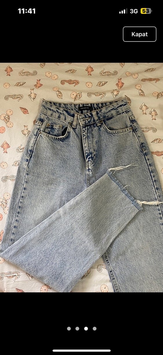 Düğmeli, bol kesim, midi boy mavi kot pantolon. Rahat ve gündelik sokak giyimi tarzında, günlük kullanım için uygun.