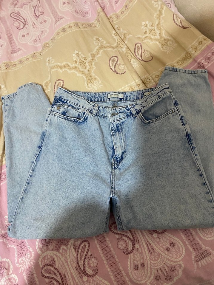 Pastel mavi renkte, düğmeli ve bol kesim midi boy kot pantolon. Hafif batik desenli, günlük sokak tarzına uygun. Minik bi kusuru var uzun bişi giyince belli olmuyor