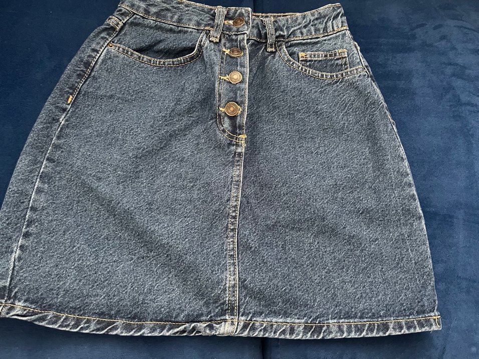 Mavi kot kumaştan, düğmeli ve bol kesim midi etek. Desensiz tasarımıyla günlük kullanıma ve rahat sokak stiline uygundur.