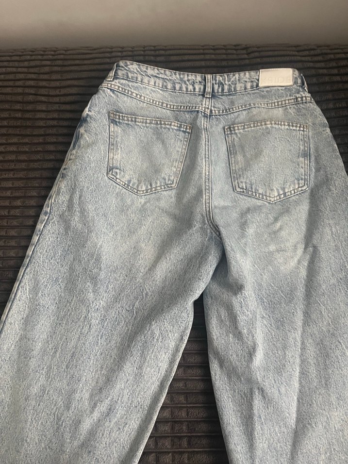 Etıkette 40 ama belden daraltma yapılmıştır o yüzden 38 dugmelı, bol kesim, midi boy kadın kot pantolon. Düz ve mavi denim kumaştan, günlük sokak tarzına uygun.