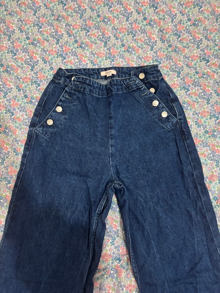 Düğmeli detaylara sahip bol kesim mavi kot pantolon, bağlama desenli, rahat günlük sokak stiline uygun.