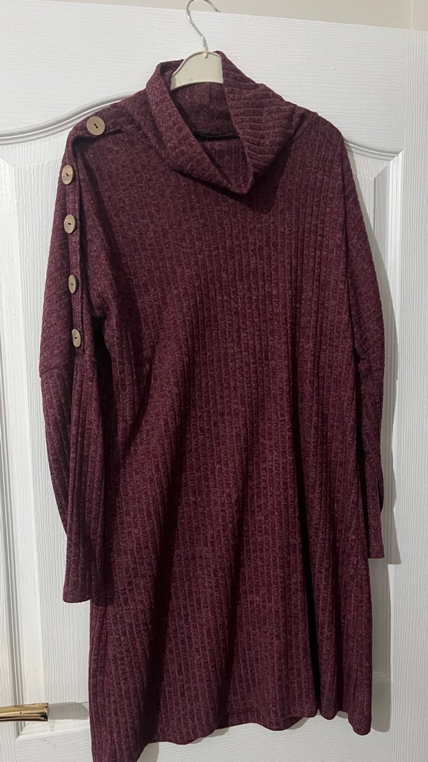 Uzun, bol kesim kadın kazağı, yüksek yakalı ve uzun kolludur. Sıcak yünden üretilmiş olup omuzda düğme detayları vardır. Rahat ve bohem tarzda, günlük kullanıma uygundur.