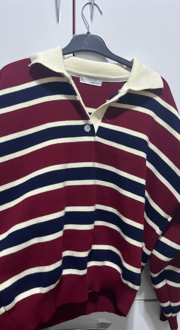Bordo pamuklu triko, uzun kollu ve düğmeli ön kısmıyla rahat bir kesime sahiptir. Çizgili desen ve yakalı tasarımıyla günlük sokak stiline uygundur. 1 defa giyildi