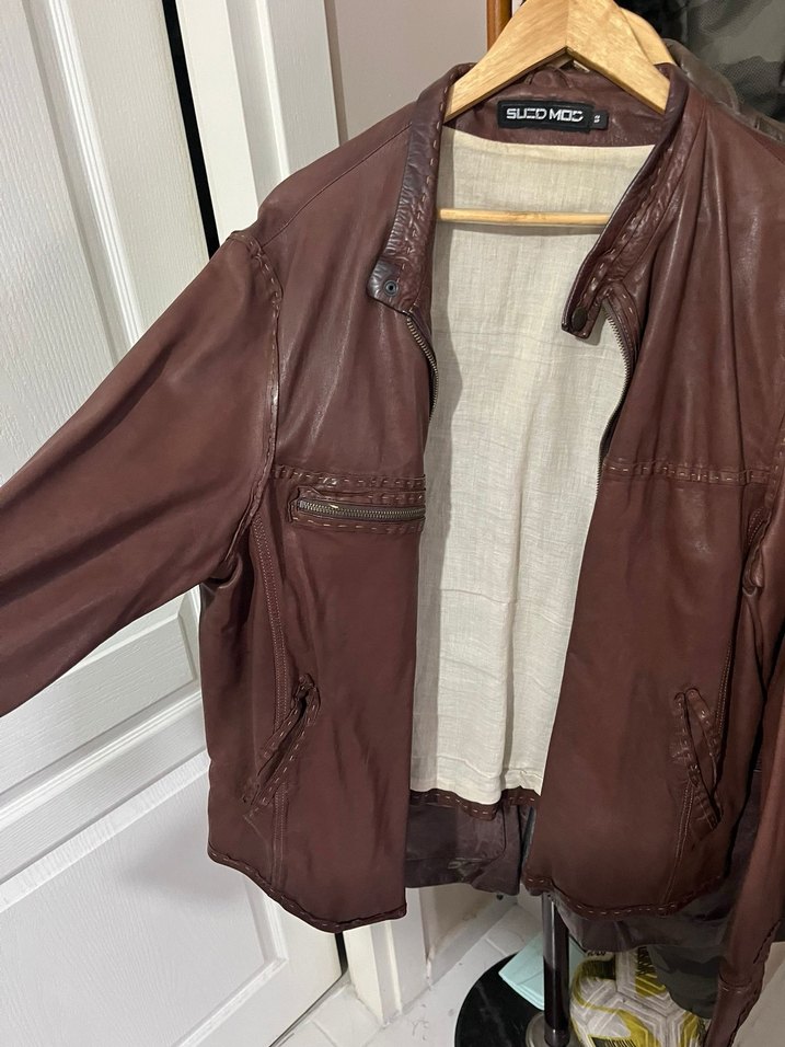 Düğmeli ön ve kesik yaka detaylı bordo deri unisex ceket. Bol kesim, uzun kollu ve parlak yüzeyli vintage biker tarzında, günlük kullanıma uygun.