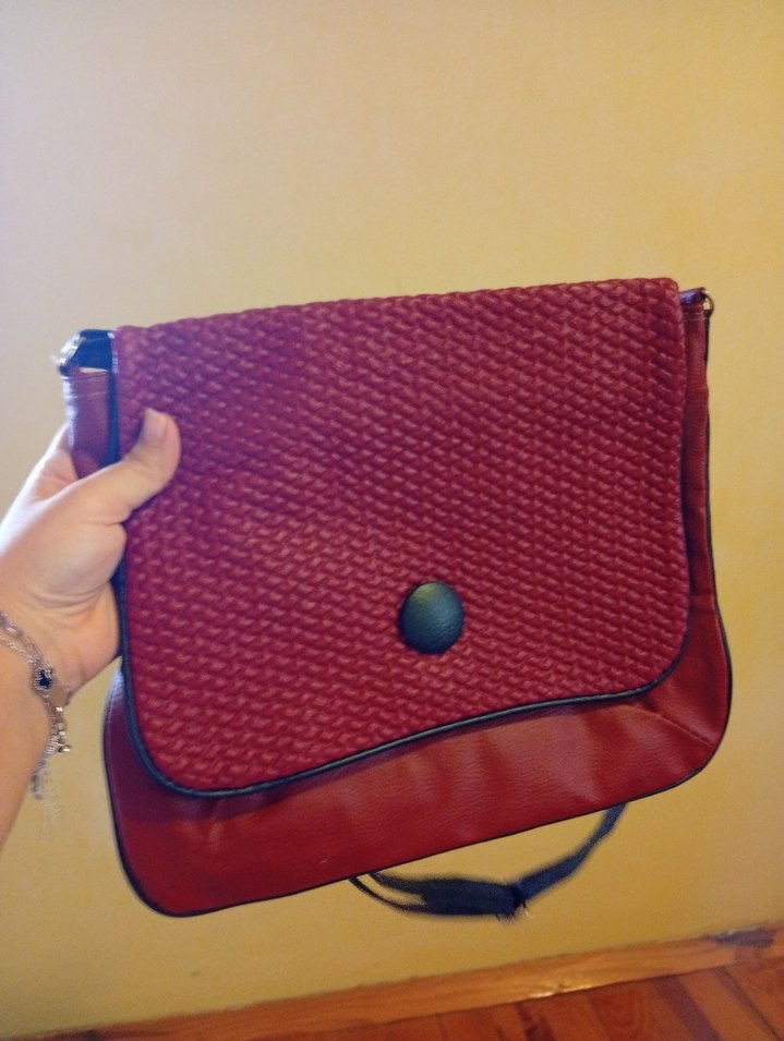 Parlak bordo deri, düğmeli kapaklı kadın çantası. Günlük kullanıma uygun vintage bohem tarzda, desensiz tasarım klasik bir görünüm sunar.