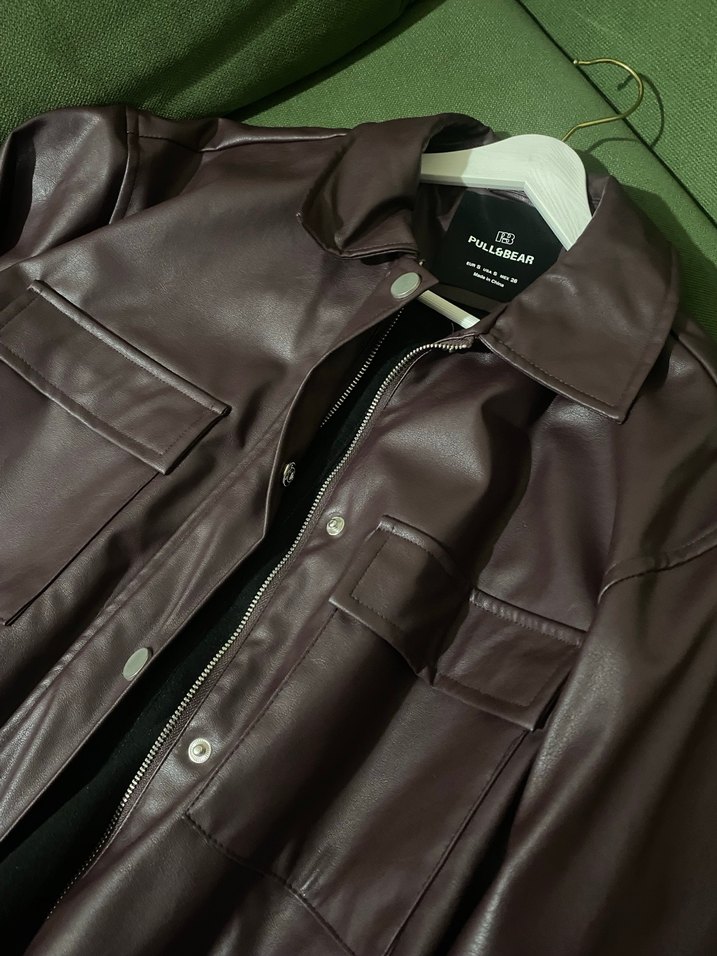 Düğmeli ön kısmı, çentikli yaka ve uzun kollu kahverengi bordo arası deri kadın ceket. Normal kesim ve midi boy, sokak stili ve günlük kullanım için uygun.Hiç giyilmedi