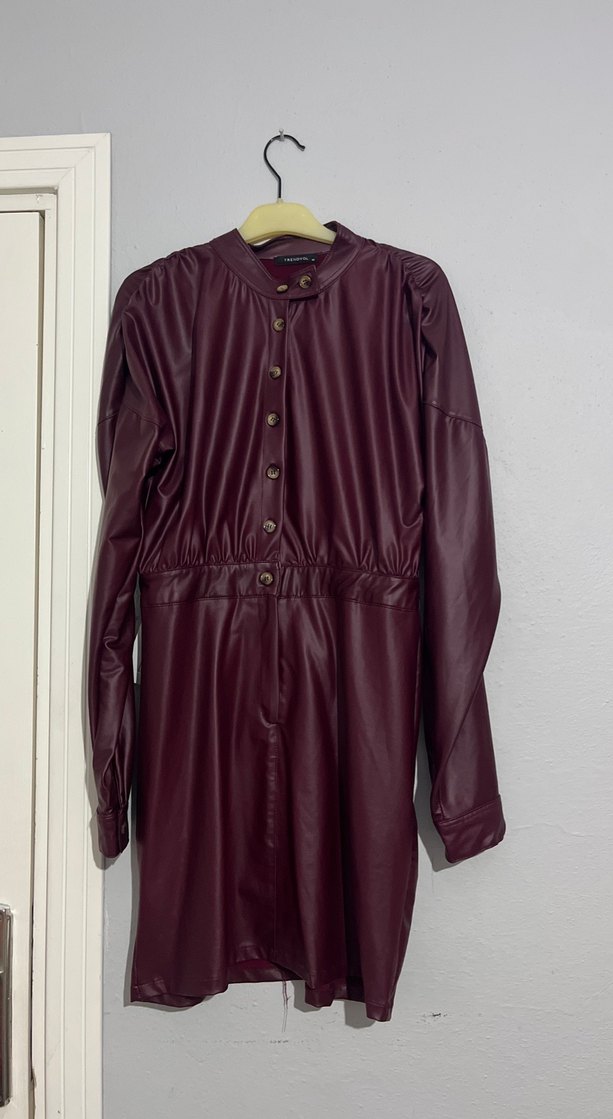 Bordo deri uzun ceket, yüksek yakalı düğmeli kapama ve bol kesimli uzun kollu tasarıma sahiptir. Ofis ve sokak stiline uygundur. Düz ve desensizdir.