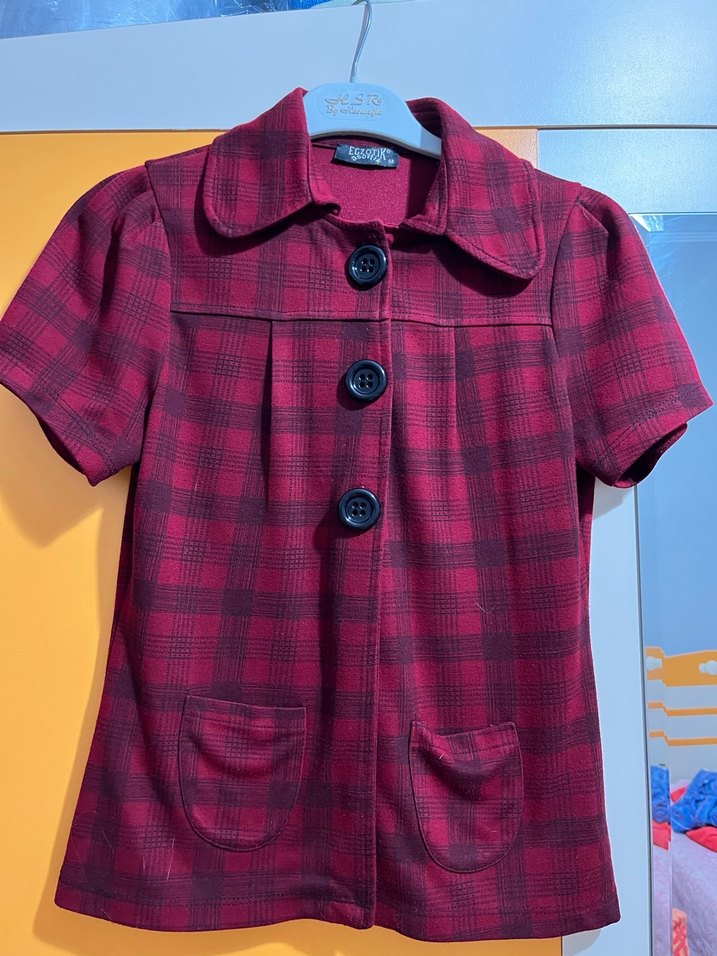 Bordo ekose desenli hırka, kısa kollu ve düğmeli ön kısmıyla rahat bir kullanım sunar. Yün kumaştan üretilmiş, body üstüne giyilebilir. Hasarsız ve temizdir.