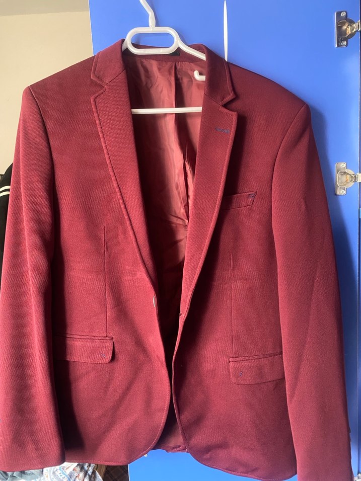 Düğmeli, uzun kollu ve klasik yaka detaylı bordo renkli erkek blazer ceket. Orta uzunlukta, rahat kesimli ve parlak dokuda, iş veya günlük tarz için uygun.