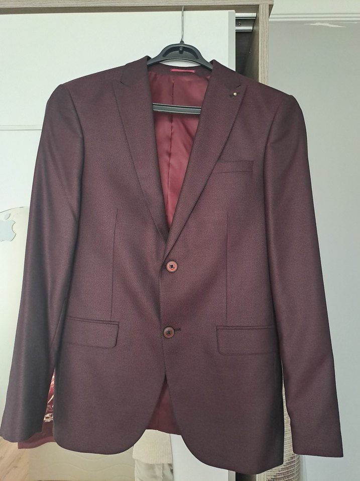 Bordo renkli erkek takım ceketi, düğmeli ve kesik yaka detaylıdır. Uzun kollu, normal kesim ve modern klasik stilde, ofis için uygundur. Desensiz, midi boydadır. Yelek, pantolon, kravat tam takımdır.