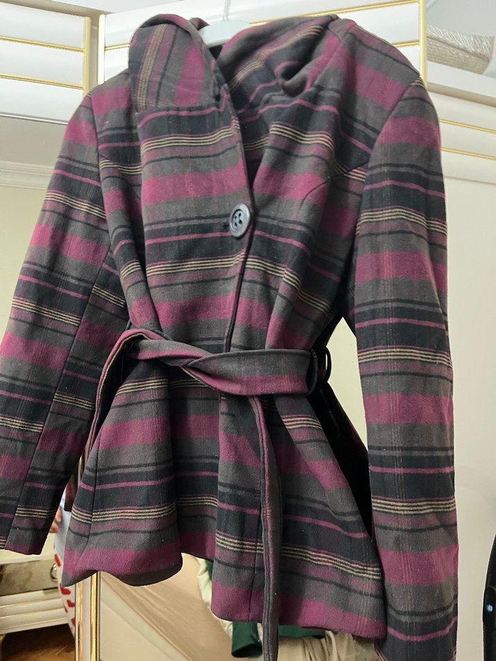 Bordo ve gri tonlarda, yün kumaştan yapılmış, düğmeli ve kemerli, normal boy midi kesim, uzun kollu, fitted hamile kabanı. Ofis kullanımı için uygundur. ❄️