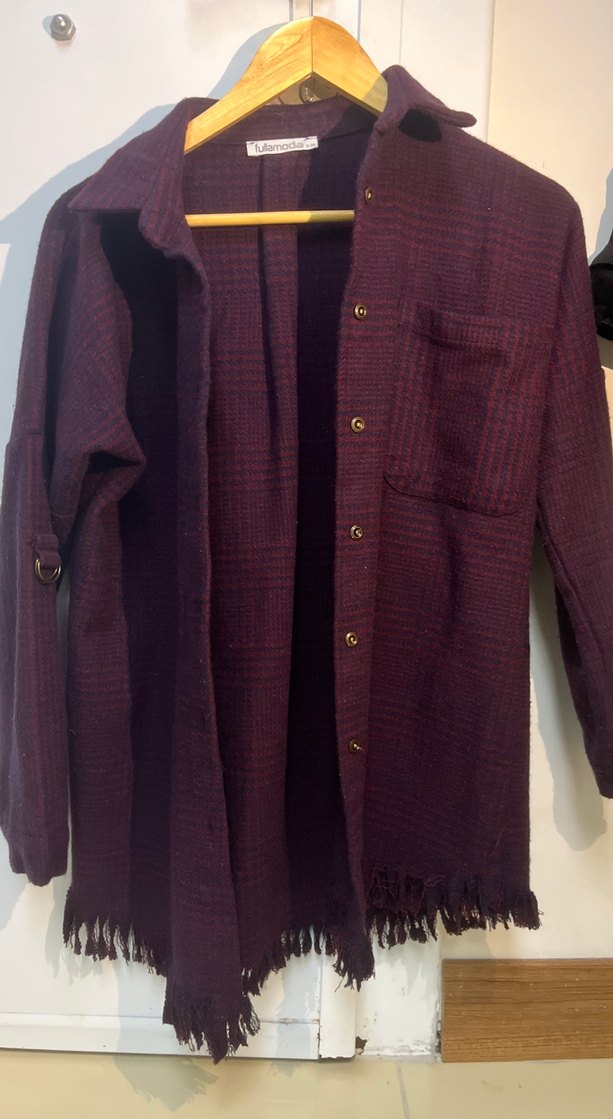 Bordo yün gömlek, düğmeli ve uzun kolludur. Geniş kesim, püsküllü uç detaylarıyla bohem tarzda rahat bir modeldir. S bedendir.