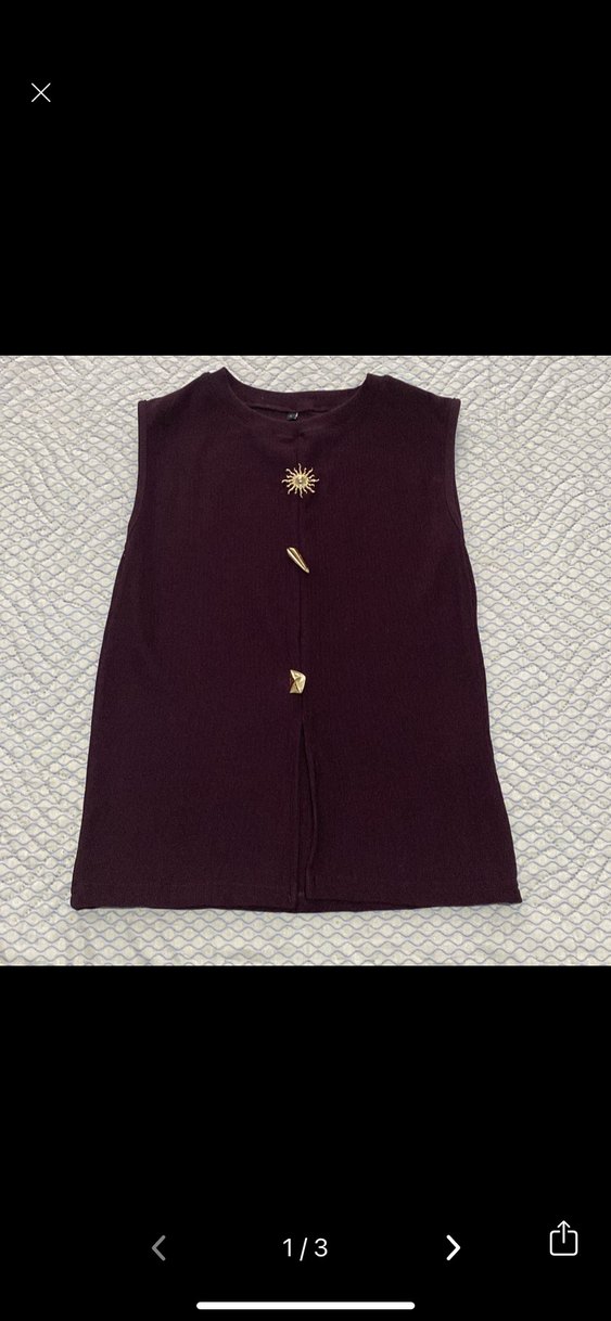 Düğmeli, yuvarlak yakalı bordo kolsuz yelek, gevşek kesim ve ipeksi dokuda, minimalist goth stiline uygun.