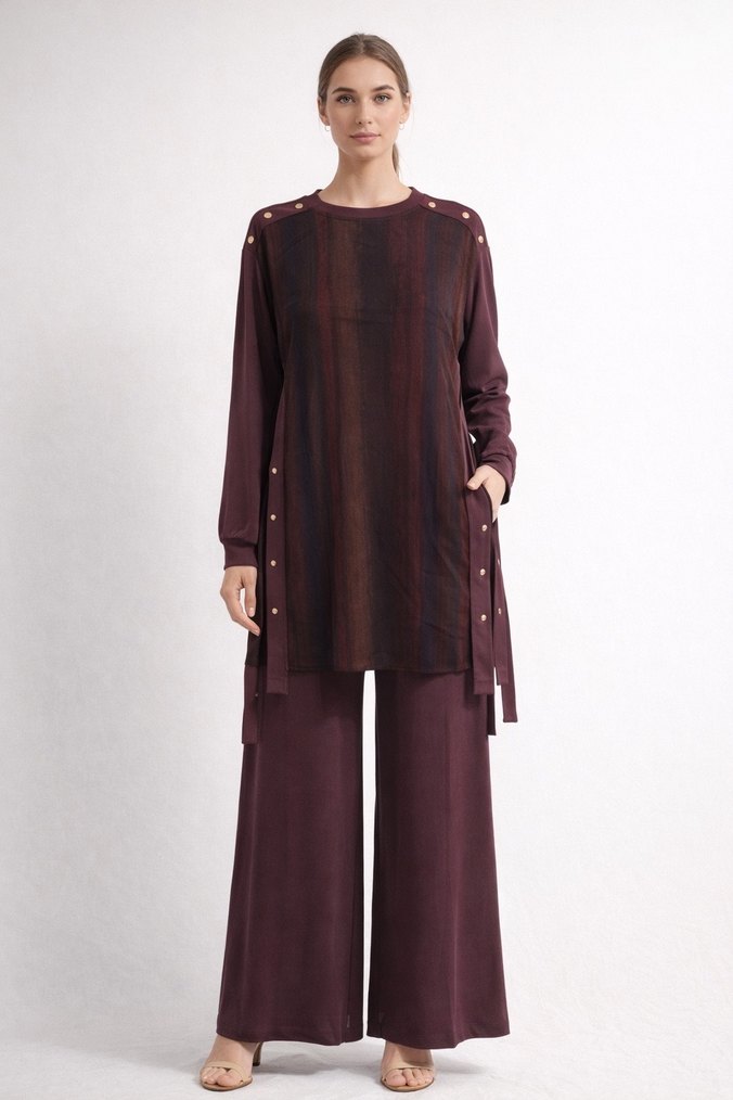 Yüksek yakalı ve uzun kollu, bordo renkli uzun tunik. İpeksi kumaştan, koyu tonlarda batik desenli. Yanlarda düğme detayları bulunur, modern ve minimal bir tarz sunar. Günlük kullanım için uygundur. Beden sorunuz