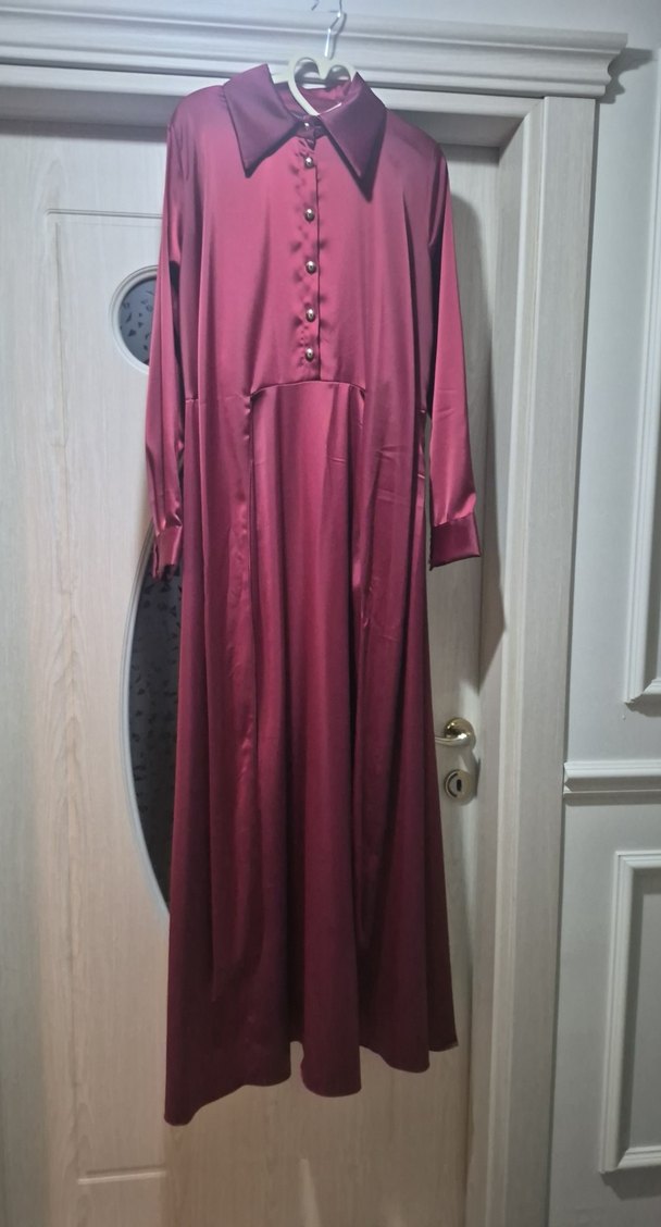 Bordo renkli, düğmeli ve notched lapel yakalı, uzun kollu, bol kesim kadın elbisesi. Yumuşak ve parlak kumaştan, vintage bohem tarzında,özel günler de kullanım için uygundur.