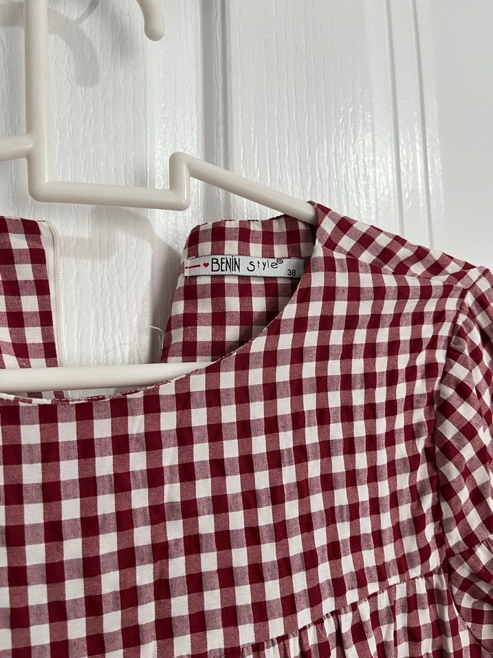 Parlak bordo kareli desene sahip, düğmeli, kayış kollu, tekne yakalı, pamuklu kumaştan bol kesim bluz. Günlük kullanım için uygun.