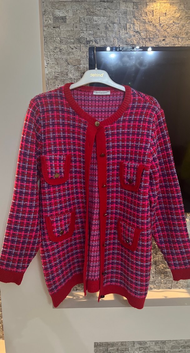 Renkli bordo kareli desene sahip, uzun kollu, düğmeli ve gevşek kesim kadın hırkası. Yumuşak örme kumaştan, günlük kullanıma uygun.