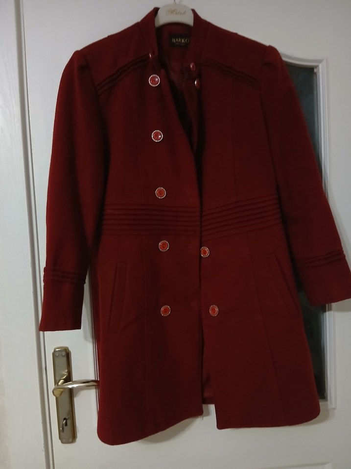 Düğmeli, dekoratif dikiş detaylı, uzun kollu bordo kadın kabanı. Ayakta yaka ve yapılandırılmış kesime sahiptir. #kaşekaban #kaban #mont