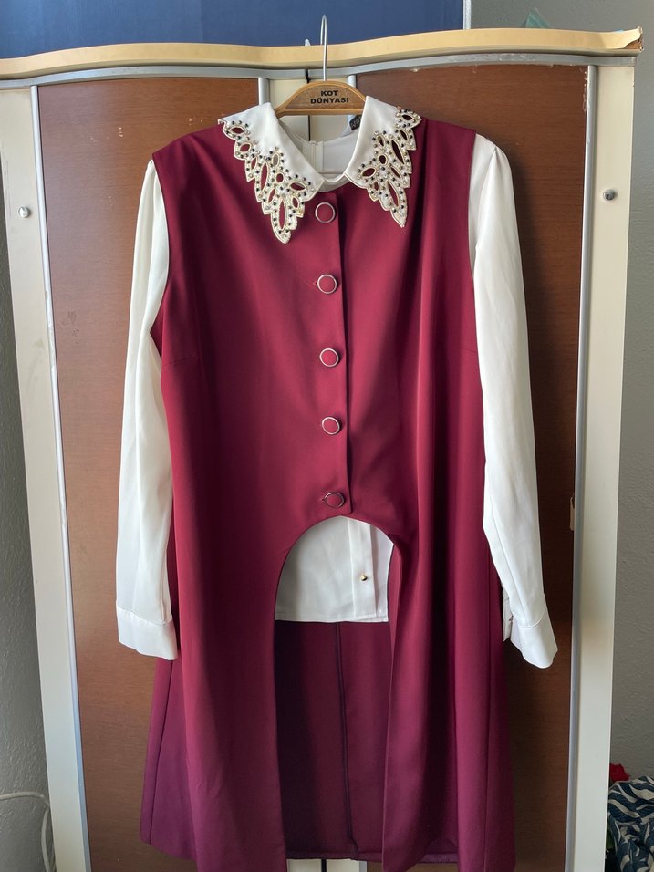 Düğmeli, yakalı ve parlak bordo renkte, bol kesim yelek gömlek ve etek Beyaz uzun kollu ve dantel yakasıyla vintage havası verir. Ofis için uygundur.