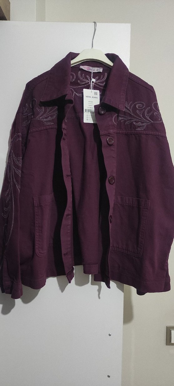 Düğmeli, uzun kollu, bordo renkli kadın ceket. Nakış detaylı, bol kesim ve normal boyda, bohem tarzda günlük kullanım için uygundur. ✨