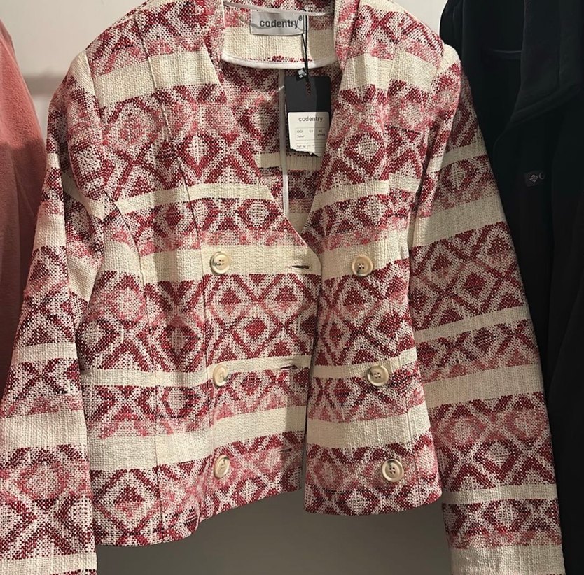 Bordo renkli, nakışlı desenlere sahip kısa kadın ceketi. Düğmeli, uzun kollu ve regular kesimdir. Ofis için uygun bohem tarzda.Vintage model hiç kullanılmadı