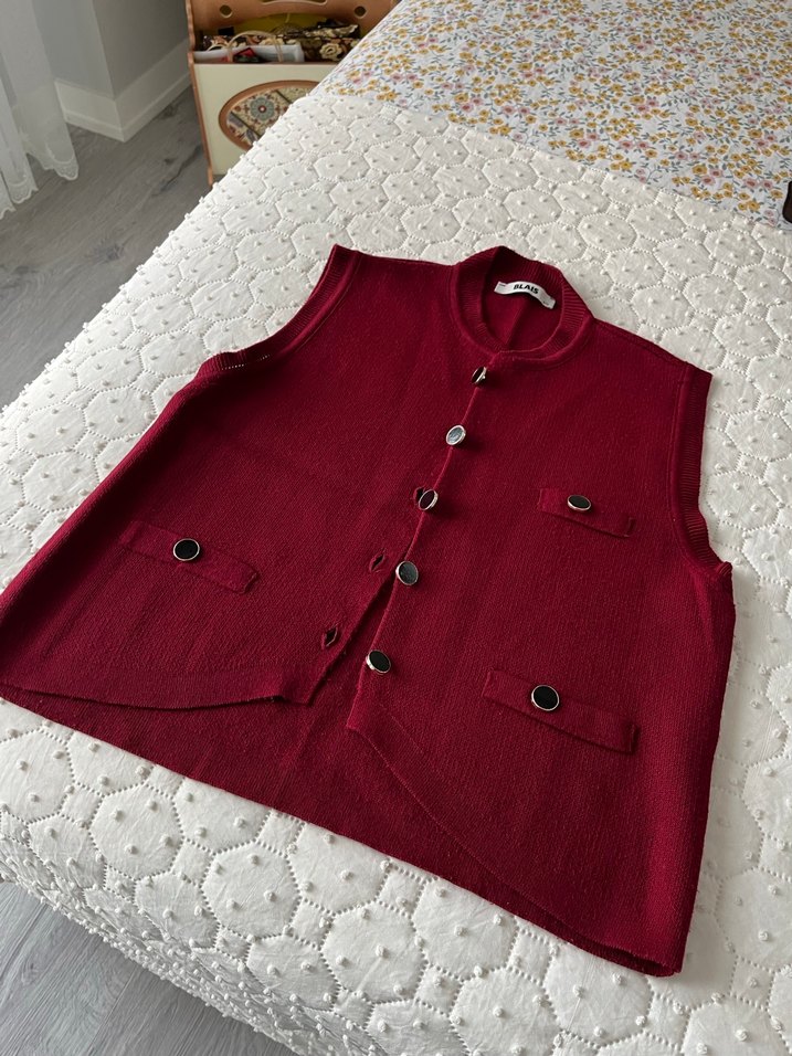 Düğmeli Bordo Triko Kadın Yelek